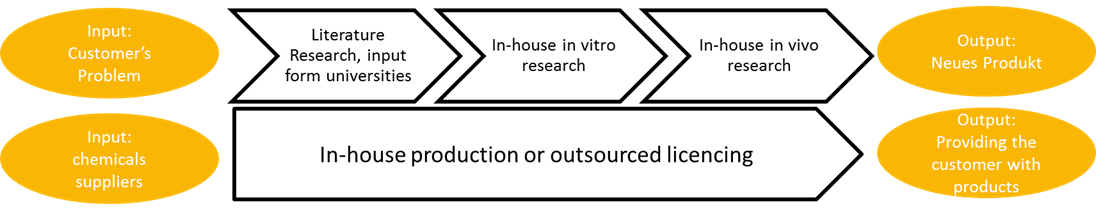 Which means: that there is the research and development process (above). This process often takes years. The input is always the customer´s problem. After research, in vivo and in vitro tests, a new product is introduced to the market, which is either produced in-house or licensed, i.e. is transferred into the second process.