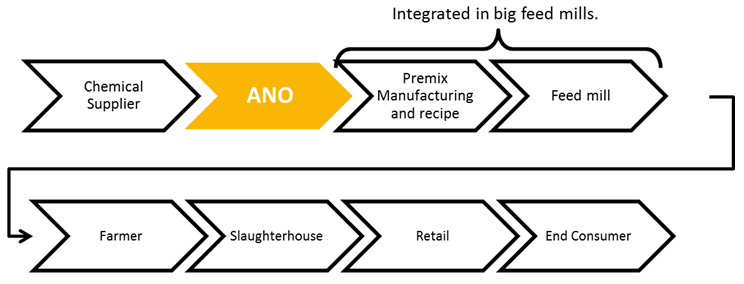 ANO receives raw materials from chemical companies, produces the minerals, and supplies these to premix manufacturers. Premix manufacturers combine additional products such as vitamins to the minerals and deliver the premix to the feed mills. These mix the premix together with energy sources such as grain and deliver it as finished feed to farmers. There are premix manufacturers that supply directly to the farmer and also feed mills that agronomists have adapted to independently manufacture the finished feed. Via the slaughterhouse and retailers the meat finally reaches the end consumer.