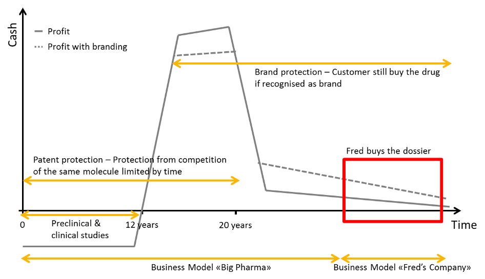 In effect, this means that once a product for Big Pharma (e. g. Novartis, GSK, etc.) has reached the end of its life span, these large companies sell the marketing authorisations and trademarks (known as "dossier") to companies like Fred’s. However, Fred’s problem is that "The market for these dossiers is very thin: There are often few sellers on the part of Big Pharma, and many potential buyers. Our management then makes a return on investment calculation: If a dossier generates an ROI that exceeds a predetermined threshold, then the dossier is purchased. As a result we have bought dossiers without considering the overall effect on our dossier and product portfolio. Lately, however, we have chosen to focus increasingly on the area of "Women’s Well-being," and have acquired two dossiers in that sector: